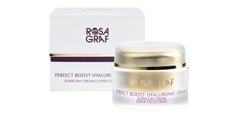 Vysoko účinný ošetrujúci 24-hodinový krém PERFECT BOOST HYALURONIC udržuje mladistvý vzhľad pokožky, dodáva jej intenzívnu hydratáciu a zlepšuje jej elasticitu. Jemné linky a vrásky sú okamžite redukované. Pre okamžite žiarivú, mladistvo sviežu pleť. Z dlhodobého hľadiska sa výrazne zlepšuje aj štruktúra a funkcia kožnej bariéry. Exkluzívna kombinácia troch typov kyseliny hyalurónovej, obohatená o peptidy vyhladzujúce vrásky, charakterizuje novú a jedinečnú dennú starostlivosť. Zosieťovanú kyselinu hyalurónovú zatiaľ do kože aplikovali len dermatológovia a lekári plastickej chirurgie. ROSA GRAF vyvinula novú starostlivosť s trojitou kyselinou hyalurónovou, ktorá vyhladzuje vrásky, nakoľko táto má pri aplikácii na povrch pokožky rovnaké vlastnosti ako pri injektáži,